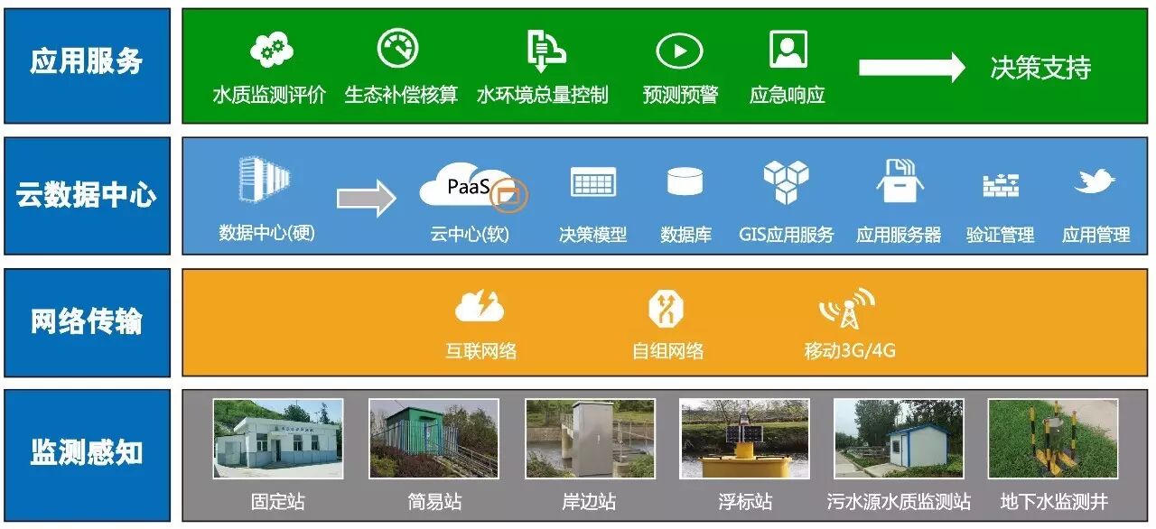 方案采用四层架构体系,即监测感知层、网络传输层、云数据中心和应用服务层。数据经水环境感知设备采集后,通过信息传输层网格上传到环保云计算平台,通过环保云平台和大数据计算,可以对水环境进行质量分析评价,总量控制,生态补偿核算,并为预测预警,应急响应等环保决策提供大数据支持。