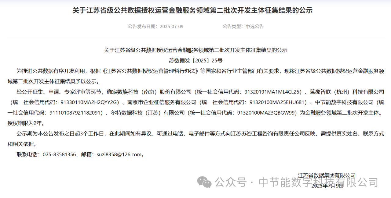 节能数科公司成功入选江苏省级公共数据授权运营金融服务领域开发主体 |